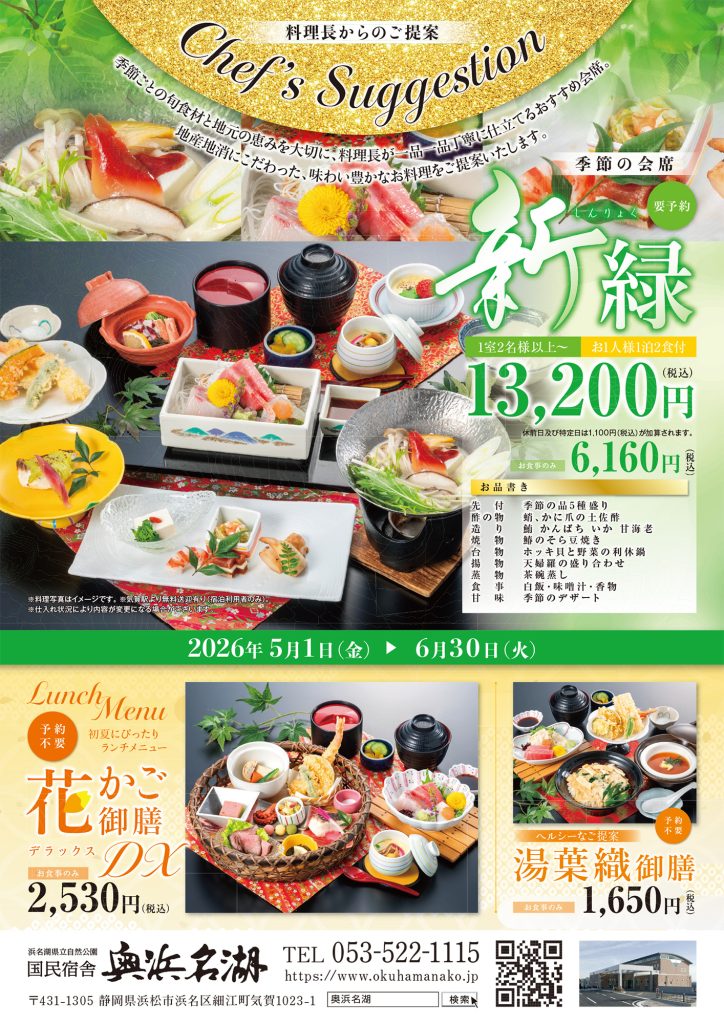 国民宿舎奥浜名湖では、「新緑 Chef’sSuggesion(料理長からのご提案)(宿泊プラン)」が期間限定で始まります。